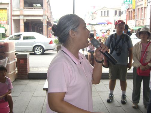 先介紹大稻埕的沿革,雖然硬體部分的發展與交通息息相關,但開放通商口岸,外商洋行進駐等看似被壓迫的行為,卻是大稻埕相較其他地區脫穎而出的主因;再就廟宇趨吉避兇、教化人心的特色做分享,有兩位慈聖宮的香客也停下來分享平日拜拜時從未注意的問題,因為早期的教科書對台灣歷史著墨甚少,有許多故事,小朋友知道的反而比爸爸、媽媽多,如三在六亡一回頭的故事。這時候客家笑話一哥陳寶鑑趕來,這是他一個月來,第四次參加大稻埕的古蹟巡禮,這份熱忱讓人感動,同時也見證,大稻埕是可以看他千遍也不厭倦的地方。