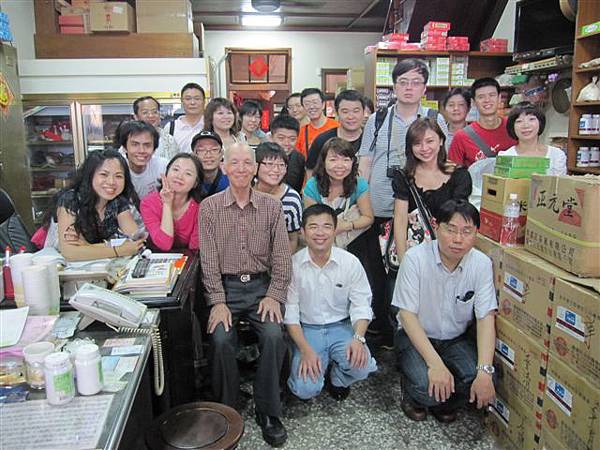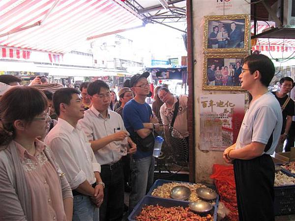 再沿著迪化街向北走,介紹建築特色和歷史背景外,隨時提醒大家注意迪化街獨一無二的特色,尤其是商家對待客人的熱忱。沿街商店幾乎都知道大稻埕老街攝影巡禮是公益活動,純屬文化參訪團,仍然給予熱烈歡迎,如林合發油飯、乾元、永盛、林復振、怡和泰、勝益、義和蔥蒜行…等,開放參觀,體驗大稻埕商人成功的道理,熱忱招待外,還請吃商店販售的特色商品,這種完全為街區發展奉獻的心情,也是台灣第一,每次導覽完,都有一股與有榮焉的喜悅。如乾元老闆和老闆娘小夫妻親自煮的白木耳湯,親自端出來請大家喝的誠懇;永盛老闆似釋迦牟尼般的微笑;林復振第四代抛棄高薪,接下家族企業的用心;義和蔥蒜行老闆柯順耀吟唱唐詩,因逢母親節前夕,還特別加吟遊子吟,從大家的掌聲,感受到這是世界上最美麗的聲音。
