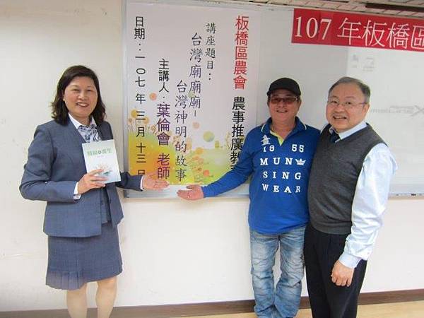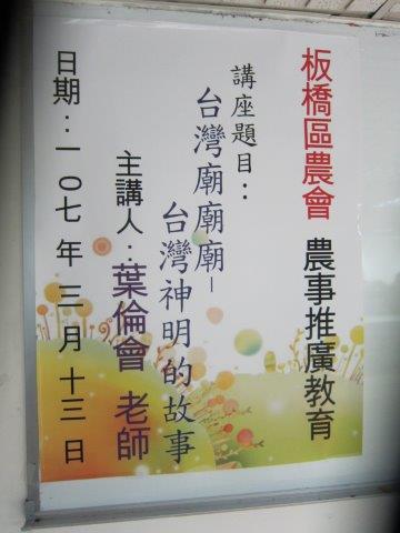 奉新北市板橋區農會黃川相指導員之命,為板橋區農會農作幹部演講「台灣廟廟廟-神明的故事」,有機會對一群認真又努力的農友分享神明的故事,心情是愉悅的。希望透過信仰,讓其耕作的農作物長得更快、更好,為自己,也為社會創造較好的生活空間。